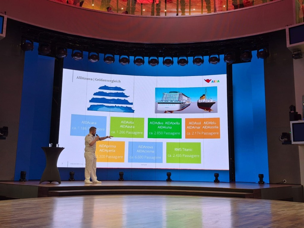 Der Seetag begann mit einem ruhigen Start und etwas Seegang. Aber recht harmlos für das, was ich so schon erlebt habe. Frühstück fiel heute mal aus, dafür ging es dann 10:30 Uhr zur Nautischen Stunde, wo der Kapitän und der 1. Offizier ein bisschen was erzählten. Zweiteres hat die erste halbe Stunde mit super interessanten Infos aus dem Bereich der Technik erzählt und dem Kapitän durften dann Fragen gestellt werden. Es war auf jeden Fall sehr lehrreich.