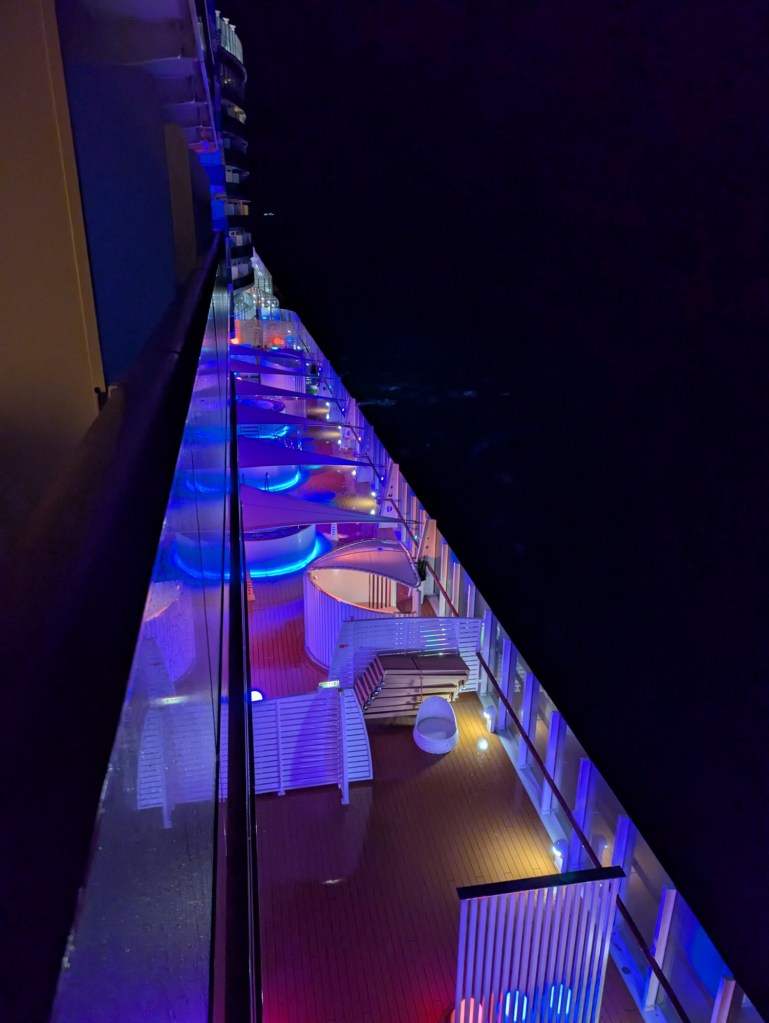 Die Wellen heute betrugen laut Kapitän zwischen 3,50m und 4m Höhe. So schlimm sieht das von oben gar nicht aus. Nach Bingo und Foto ging ich mal für ein halbes Stündchen in meine Kabine und auf dem Balkon zum Durchatmen. So eine Pause brauche ich dann doch ab und an mal.