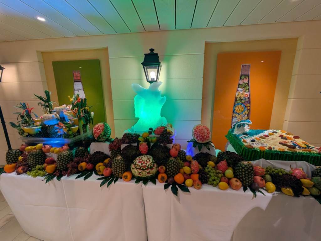 Und dann stürmten viele los zum Abendessen, auch wir drei. Ein letztes Mal Buffet-Restaurant zum Abend. Uns kann es schon ganz schön gut gehen auf solch einer Reise mit einem schwimmenden Hotel.