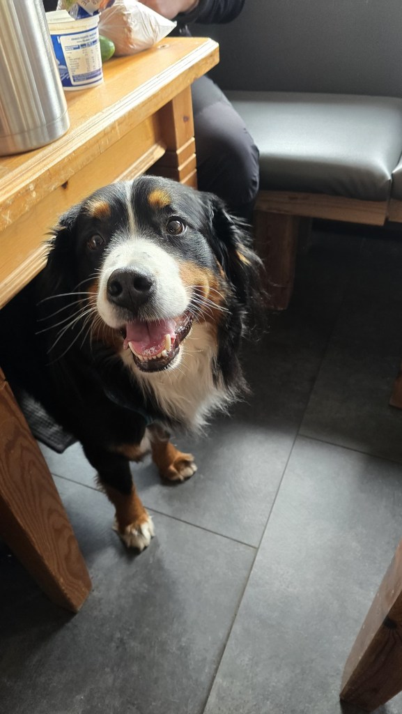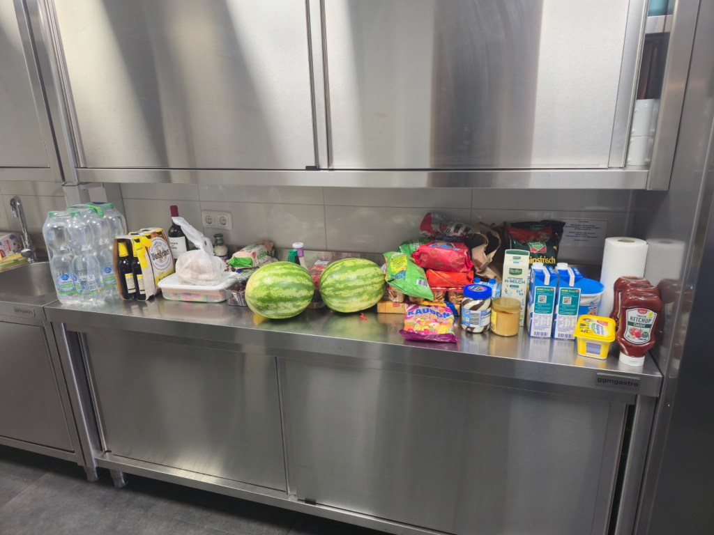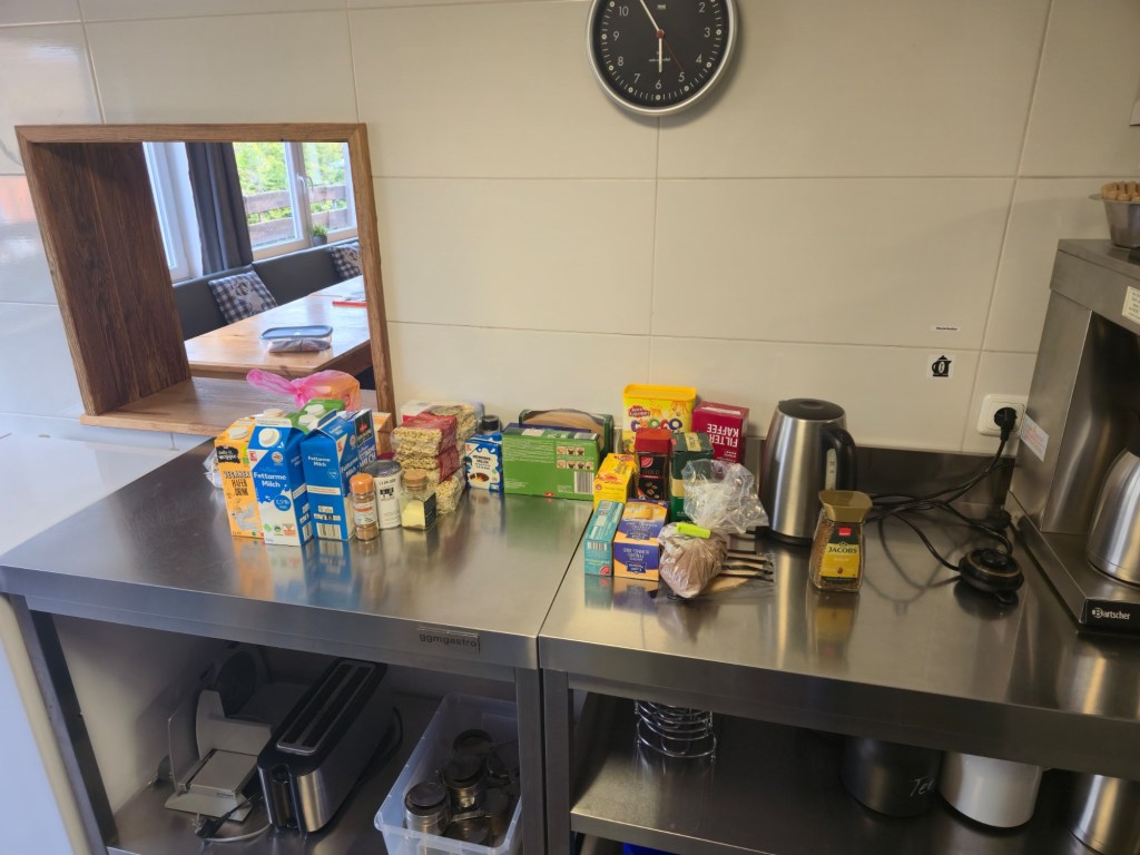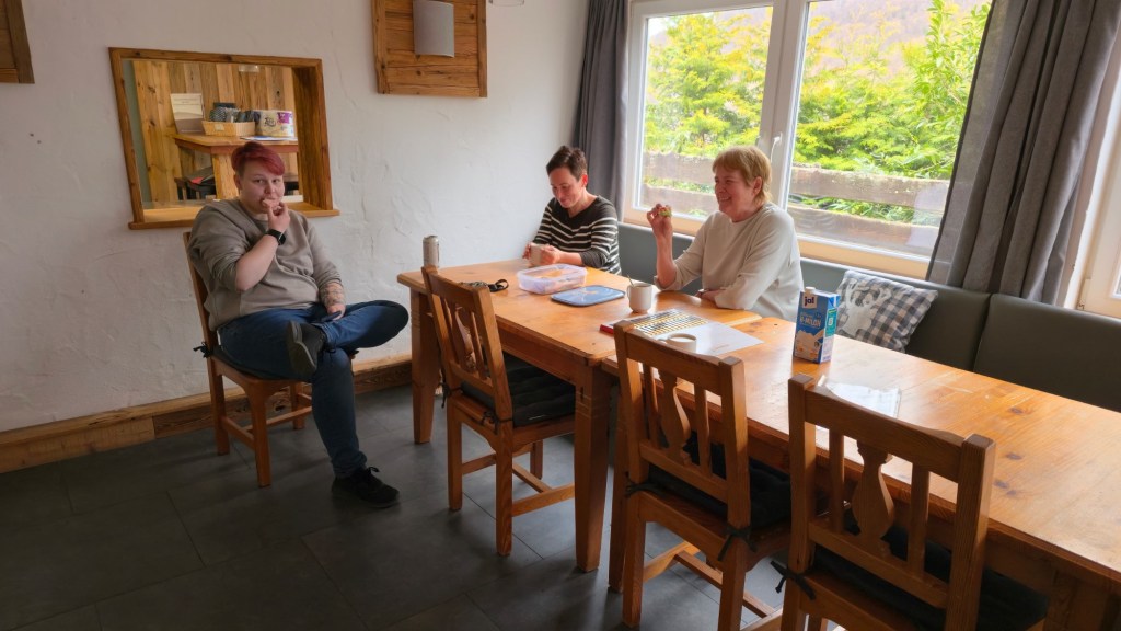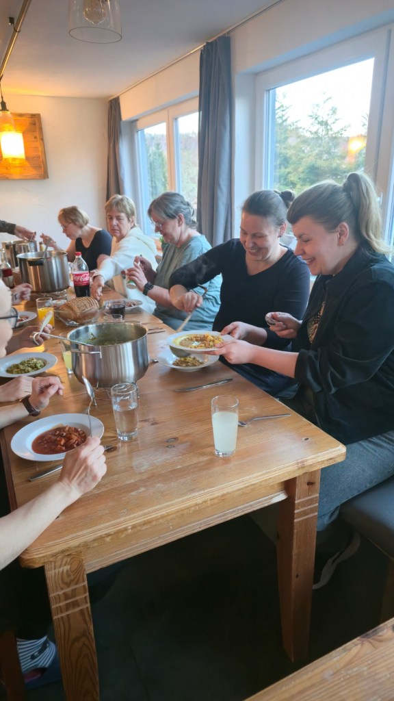 Zum gemeinsamen Abendessen war der Suppenabend geplant. 5 heiß begehrte Sachen standen zur Auswahl: Süßkartoffel-Kürbis, Soljanka, Kichererbsen-Curry, Steckrübeneintopf und Hirse-Gemüse-Eintopf. Nur gut, dass die Großküche 6 Gasherd-Flächen hatte. So konnte alles gleichzeitig erwärmt werden und es wurde gemütlich zusammengesessen und -gegessen. Die Gespräche untereinander wurden intensiver und man lernte sich näher kennen. Ava war den ersten Abend dann noch etwas mit unten, weil sie das zu Beginn immer zur Sicherheit benötigt. Aber das war in Ordnung.