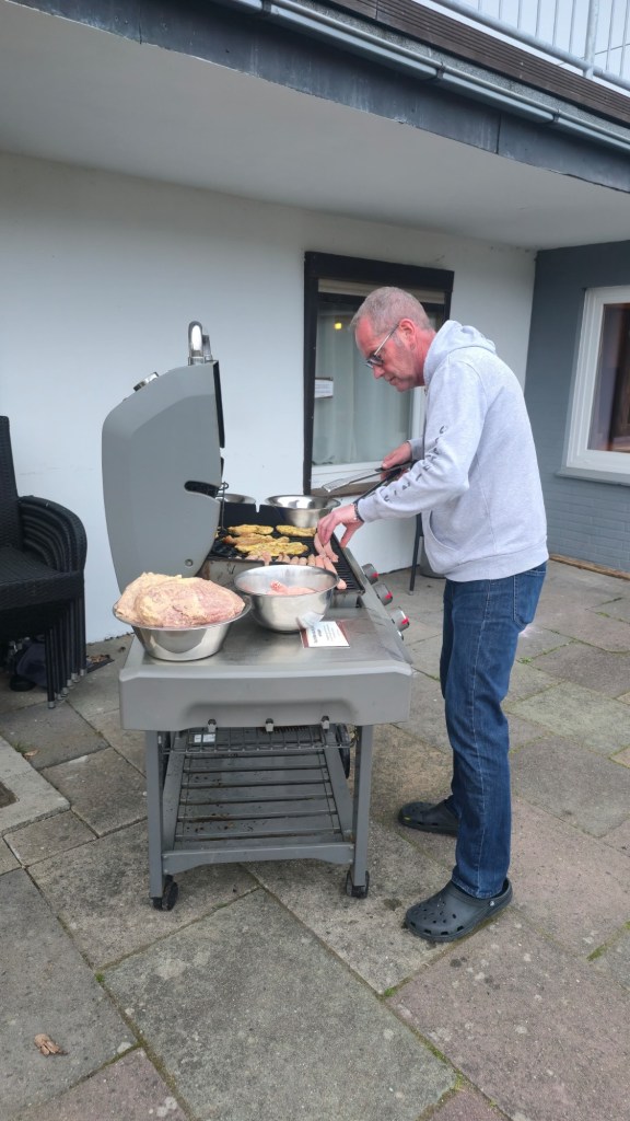 Diejenigen, die zur kleinen Abendrunde nicht mitgelaufen sind, deckten bereits den Tisch ein für den Grillabend. Ja, es gab mal wieder die beste eingeflogene Ware frisch vom Tisch. Der Gasgrill brachte zwar kleine Herausforderungen mit sich, aber der Grillmaster hat es gut hinbekommen. Und so lief die Ware gut vom Tisch. Dazu noch einige Salate und Brötchen und schick war der Abend. Und so verging auch der zweite Tag schon wie im Fluge. Abends gab es noch eine kleine Entleerungsrunde für die Hunde. Ava war von diesem Tag schon gut geschafft.