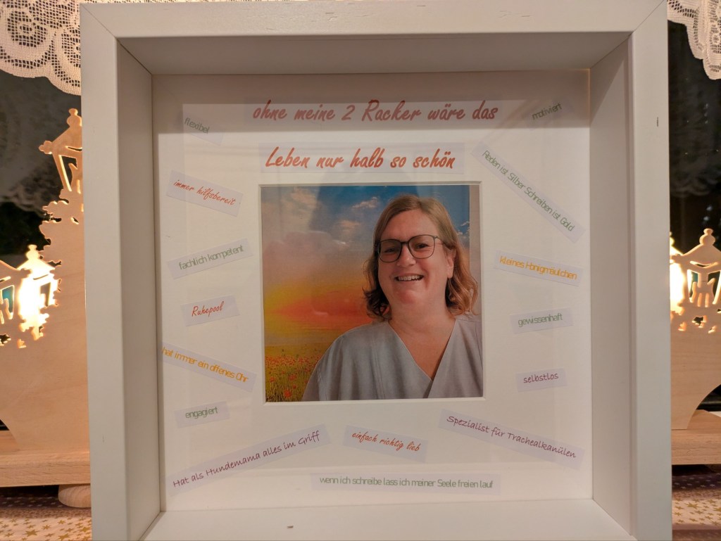Ja, aktuell genieße ich mein Leben und lebe einfach. Da lassen dann auch mal ein paar Mitbringsel ihre Nebenwirkungen mit liegen. Und so war ich aus dem Urlaub heraus ein paar Tage arbeiten, bis es mich umgehauen hat. So hieß es für mich schonen und Entspannung nachholen. Die anderen feierten auf der Weihnachtsfeier. Wir ahnten ja schon seit längerem, dass sich die Chefin und eine Kollegin mal wieder was ausheckten. Wobei der Grundgedanke ja wirklich klasse war beim Hinterfragen. Das Thema hatte ich im Verlauf schon einmal erwähnt. Wenn du gefragt wirst, was du Positives an einem Menschen siehst, den du schon länger kennst. Dir fallen auf Anhieb oft erst irgendwelche Macken oder gar Negatives ein, aber positiv? Why not? Aber probiert es mal aus, das ist gar nicht so einfach. Ich war sicher nicht die Einzige beim Befragen, wo das so auffiel. Und dann bekommst du als kleines Present von Station so etwas in die Hand, jeder Einzelne von uns. Und was soll ich sagen, es trifft mitten hinein und tut so gut. Danke für die beiden, die sich damit beschäftigt haben. Diese Idee hat sicher bei jedem etwas ausgelöst. Also hier definitiv!